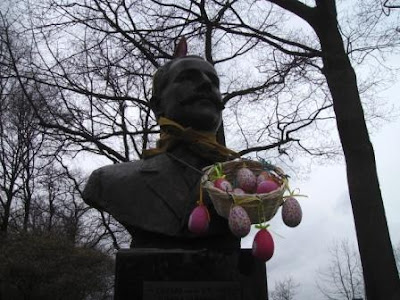 Feestdagen. Vroeger waren ze dodelijk saai en konden ze me niet snel genoeg voorbij zijn. Tegenwoordig kan ik nauwelijks wachten tot het zo ver is. Louter en alleen vanwege Eduard. Diens buste is nog geen twee jaar geleden in Griendtsveen geplaatst, maar nu al is de prachtige traditie ontstaan om haar bij bijzondere gelegenheden van passende dracht en attributen te voorzien: Gelukkig is het over drie weken alweer Koninginnedag. En vijf dagen daarna Bevrijdingsdag. En een week daarna Moederdag. En een week daarna Hemelvaart. En een week daarna Pinksteren. En drie weken daarna Vaderdag. En twee weken daarna wordt Nederland Europees kampioen.